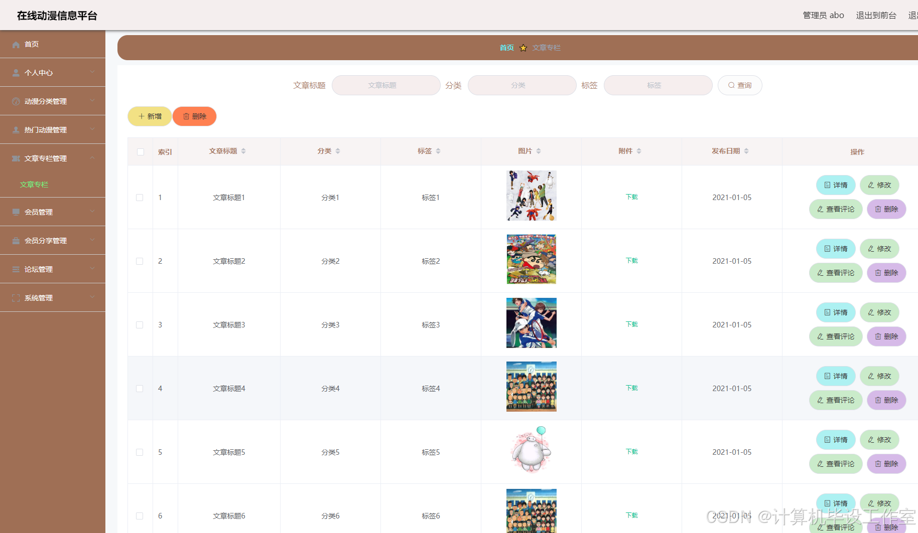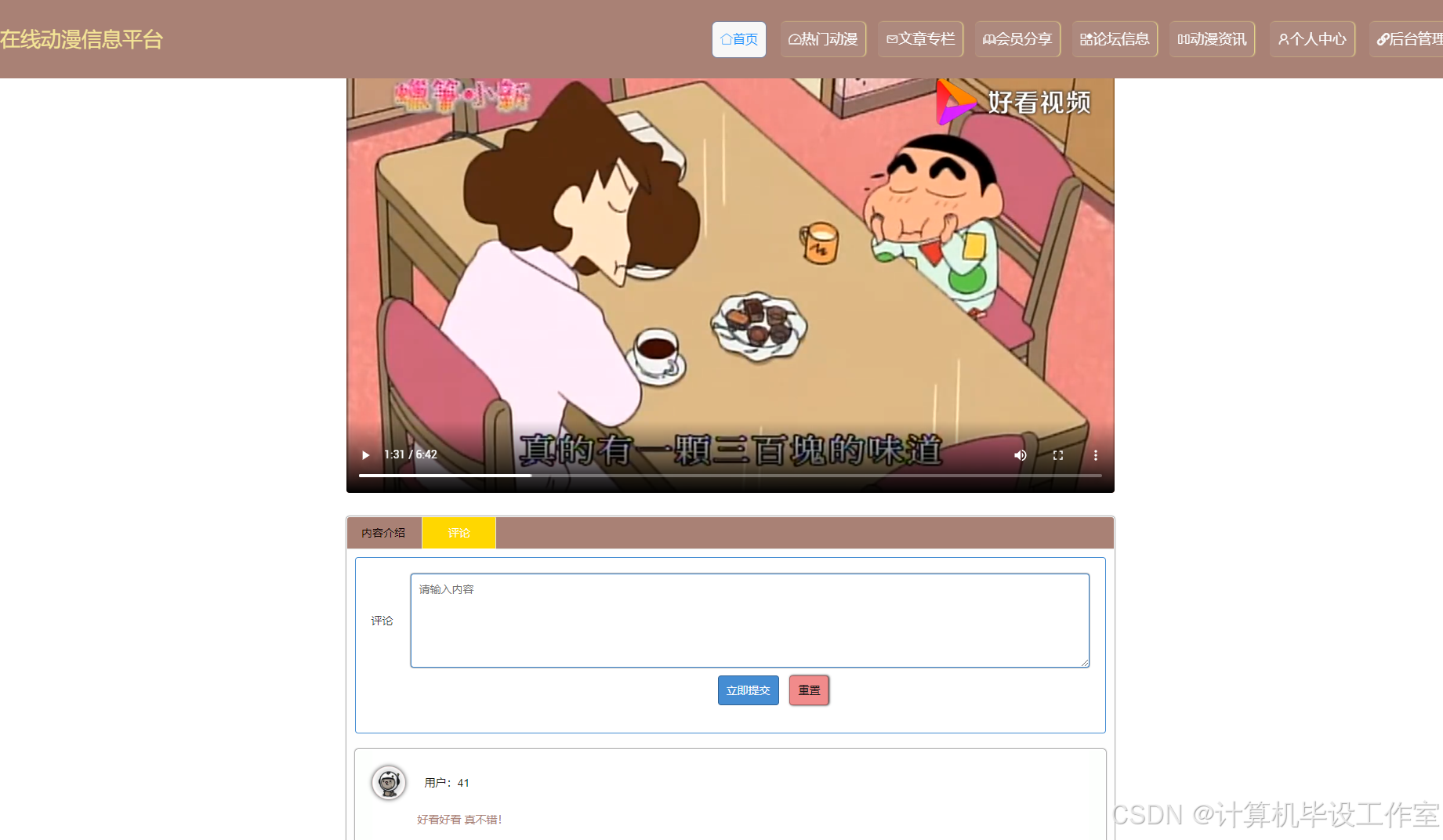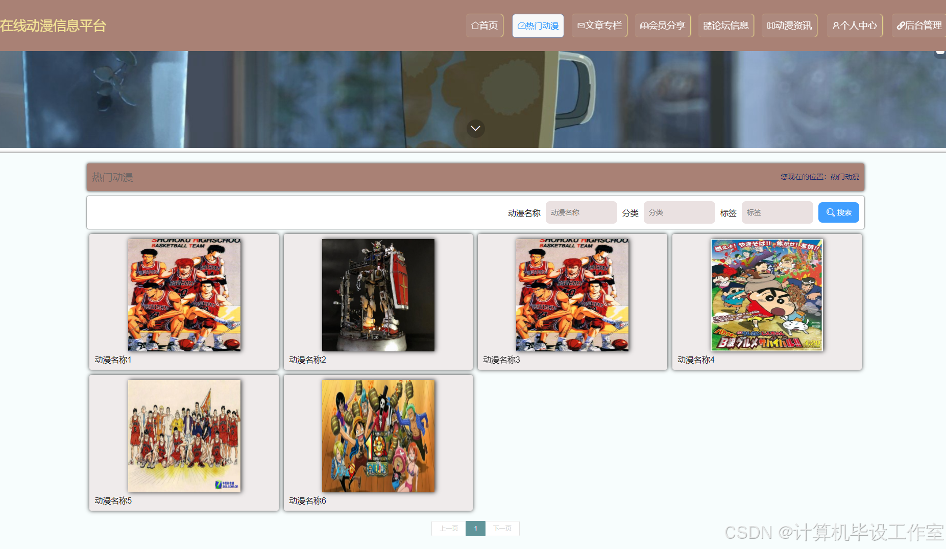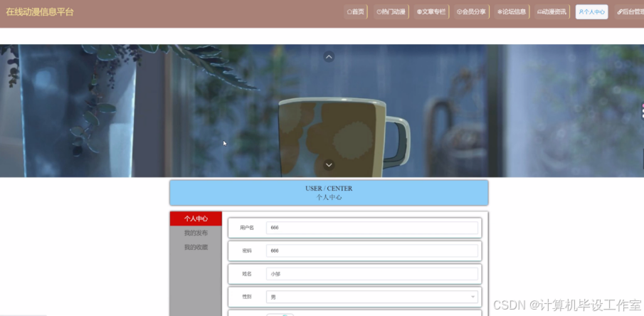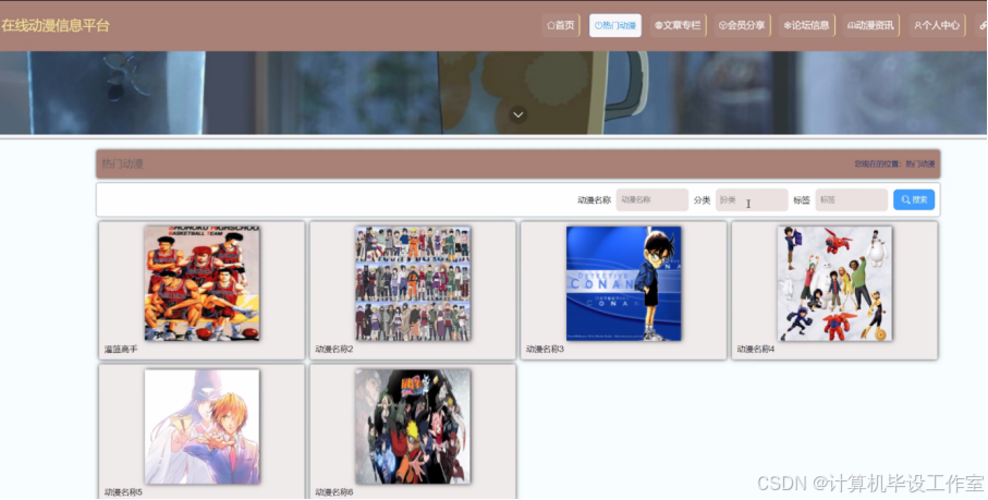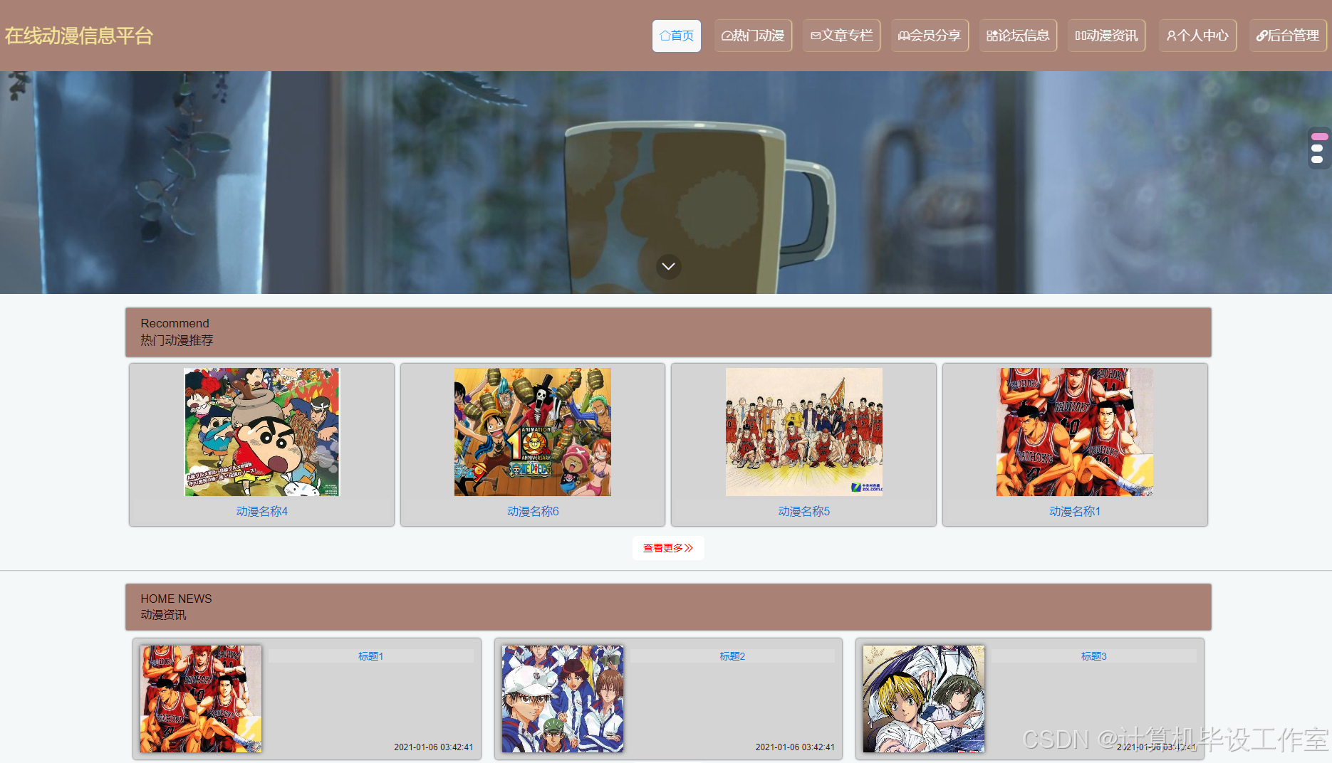 前台首页实现热门动漫、文章专栏、会员分享、论坛信息、个人中心、后台管理等。