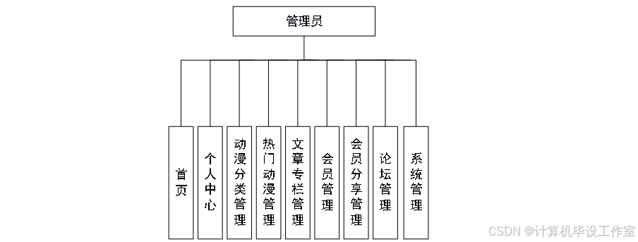 管理员登录后可进行首页、个人中心、动漫分类管理、热门动漫管理、文章专栏管理、会员管理、会员分享管理、论坛管理、系统管理,管理员的用例如图3-1所示。
