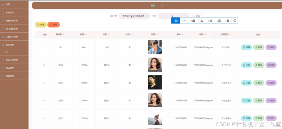 会员信息,管理员通过会员信息可以在线查看用户名、密码、姓名、性别、头像、手机、邮箱、个人签名、操作等信息,进行查看或修改、删除操作,如图5-13所示。