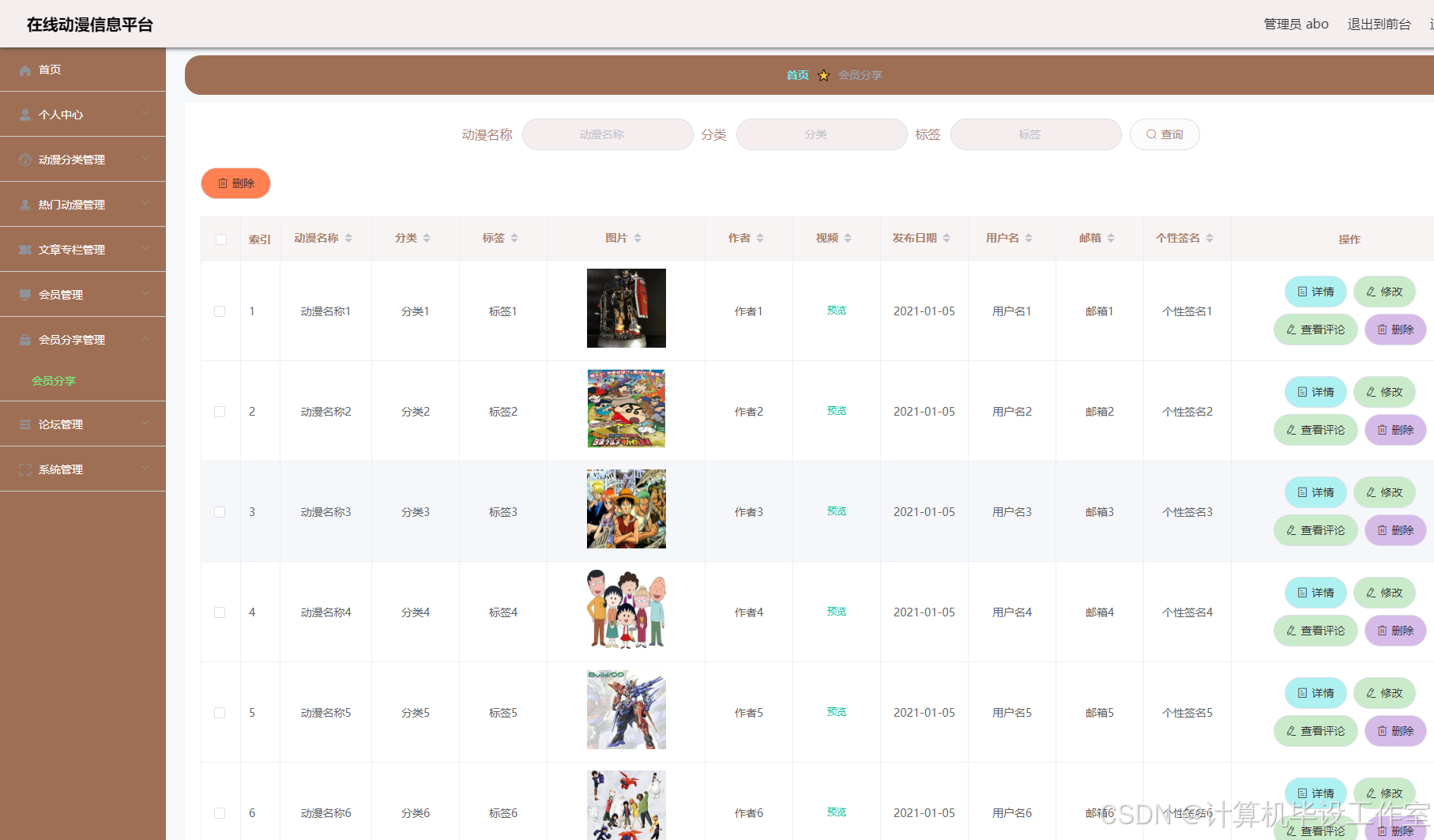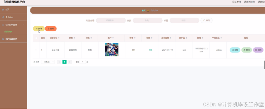 会员分享管理:通过会员分享管理可以进行获取动漫名称名称、分类、标签、图片、作者、视频、发布日期等进行修改、删除信息,如图5-9所示。
