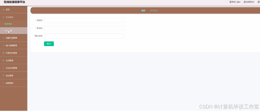 个人信息,管理员对个人中心进行操作填写原密码、新密码、确认密码并进行添加、删除、修改以及查看。如图5-11所示。