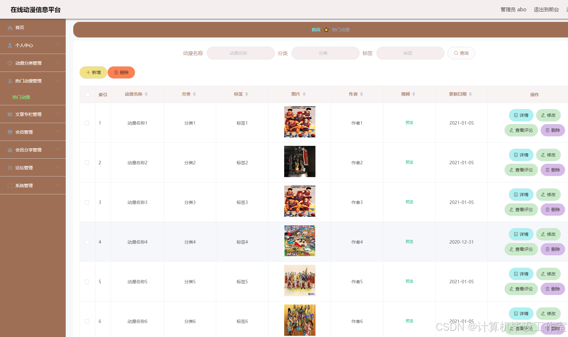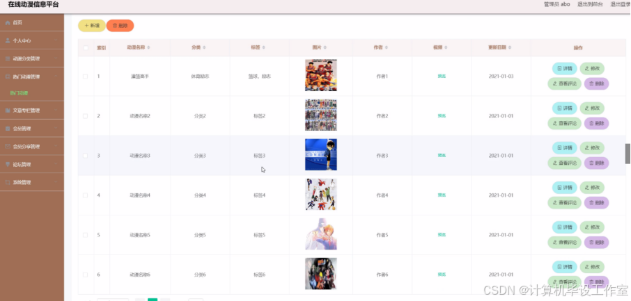 热门动漫信息,管理员通过热门动漫信息可以在线查看动漫名称、分类、标签、图片、作者、视频、更新日期、操作等信息,进行详情或修改、删除操作,如图5-12所示。