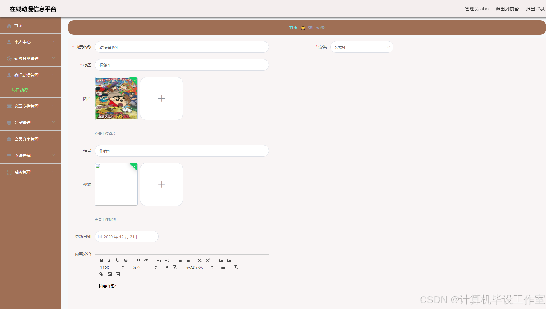 系统管理也都将通过计算机进行整体智能化操作,对于在线动漫信息平台所牵扯的管理及数据保存都是非常多的,例如管理员;首页、个人中心、动漫分类管理、热门动漫管理、文章专栏管理、会员管理、会员分享管理、论坛管理、系统管理等,会员:首页、个人中心、会员分享管理、我的收藏管理,前台首页:首页、热门动漫、文章专栏、会员分享、论坛信息、个人中心、后台管理等这给管理者的工作带来了巨大的挑战,面对大量的信息,传统的管理系统,都是通过笔记的方式进行详细信息的统计,后来出现电脑,通过电脑输入软件将纸质的信息统计到电脑上,这种方式比较传统,而且想要统计数据信息比较麻烦,还受时间和空间的影响,所以为此开发了在线动漫信息平台;为会员提供了方便管理平台,方便管理员查看及维护,并且可以通过需求进行动漫信息内容的编辑及维护等;对于会员而言,可以随时进行查看热门动漫、文章专栏、会员分享、论坛信息,管理员可以足不出户就可以获取到系统的数据信息等,而且还能节省会员很多时间,所以开发在线动漫信息平台给管理者带来了很大的方便,同时也方便管理员对会员信息进行处理。