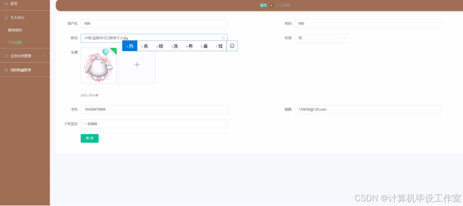 个人中心,会员通过点击个人中心可以进行查看用户名、密码、姓名、性别、头像、手机、邮箱、个人签名等信息进行添加、删除、修改等等操作,如图5-7所示。