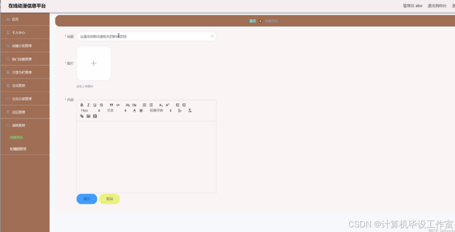 管理员通过系统管理页面查看轮播图/动漫资讯等进行上传图片进行添加、删除、修改以及查看并对整个系统进行维护等操作,进行查看或添加修改或删除,如图5-14所示。