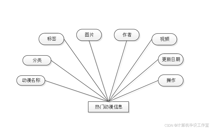 热门动漫信息:动漫名称、分类、标签、图片、作者、视频、更新日期、操作实体E-R图,如图4.6所示。