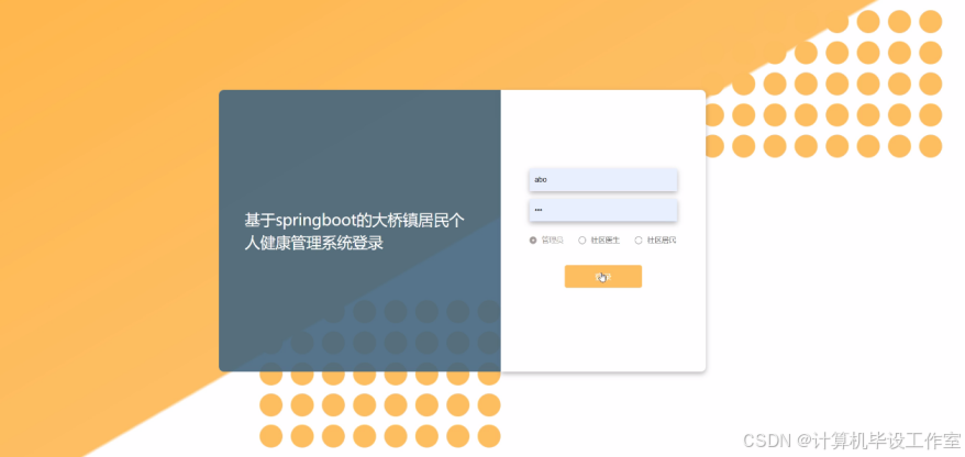 社区居民登录,社区居民在登录页面填写用户账号、密码,角色,完成登录,如图5-3所示。