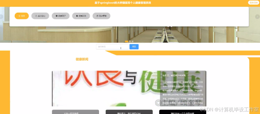 社区居民登录到系统前台,可以对首页、坐诊信息、健康测评、健康新闻、后台管理等进行相应操作,如图5-1所示: