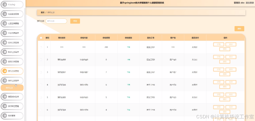 体检记录管理:在体检记录管理页面,对预约名称、体检内容、体检费用、体检报告、医生工号、用户名、是否支付等内容,进行修改,删除等操作,如图5-14所示: