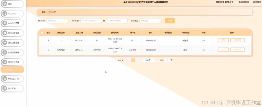 预约记录管理,在预约记录管理页面查看预约名称、医生工号、预约内容、预约时间、用户名、手机、审核回复、审核状态等内容,进行详情等操作,如图5-22所示。
