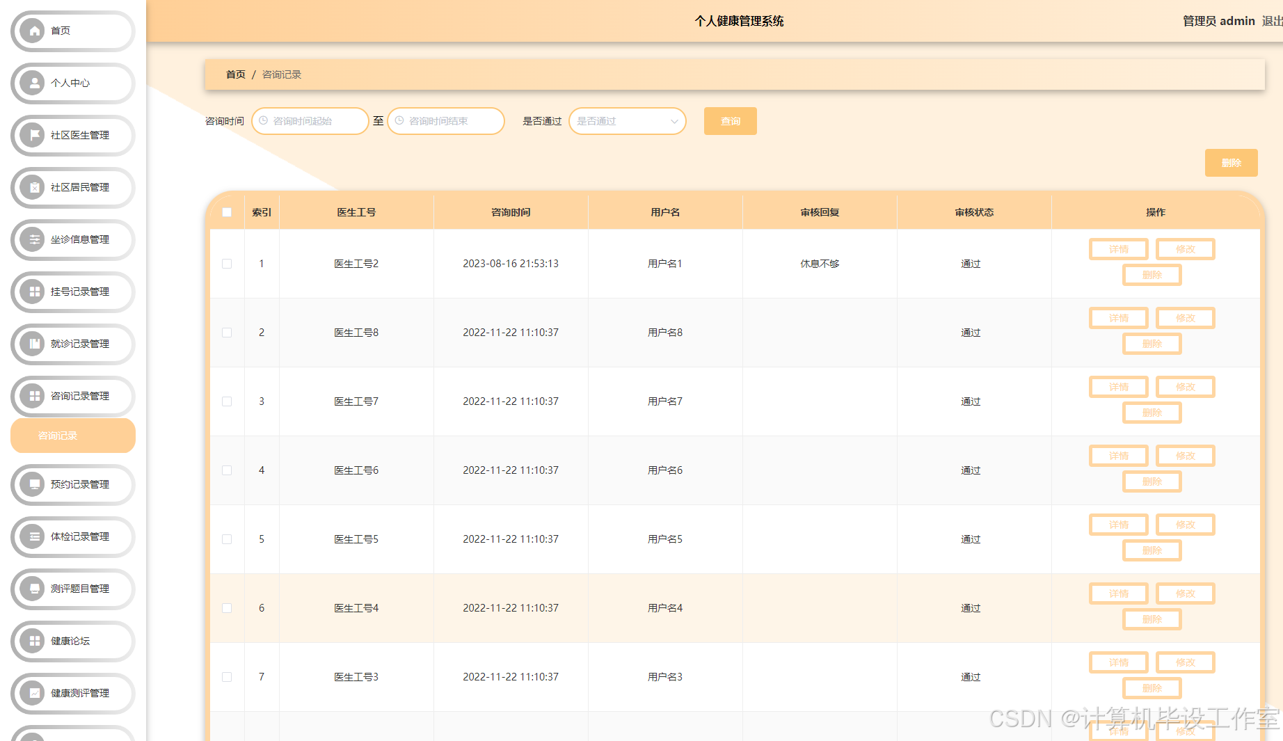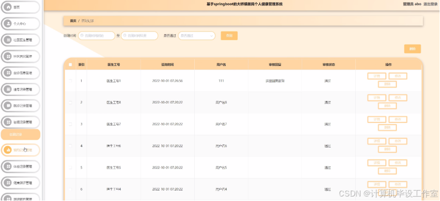 咨询记录管理:在咨询记录管理页面,对医生工号、咨询时间、用户名、审核回复、审核状态等内容,进行修改,删除等操作,如图5-13所示: