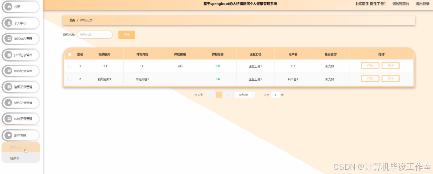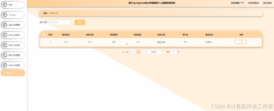 体检记录管理,在体检记录管理页面查看预约名称、体检内容、体检费用、体检报告、医生工号、用户名、是否支付等内容,进行详情等操作,如图5-23所示。