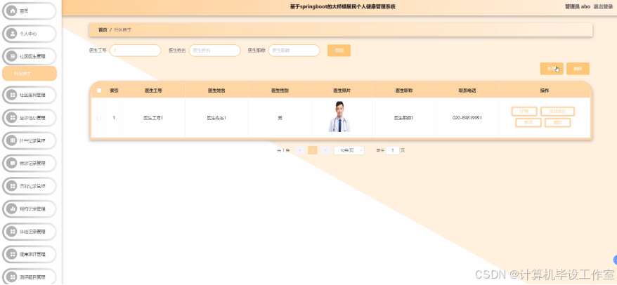 社区医生管理:在社区医生管理页面,可以查看医生工号、医生姓名、医生性别、医生照片、医生职称、联系电话等信息,进行修改、删除等操作,如图5-9所示: