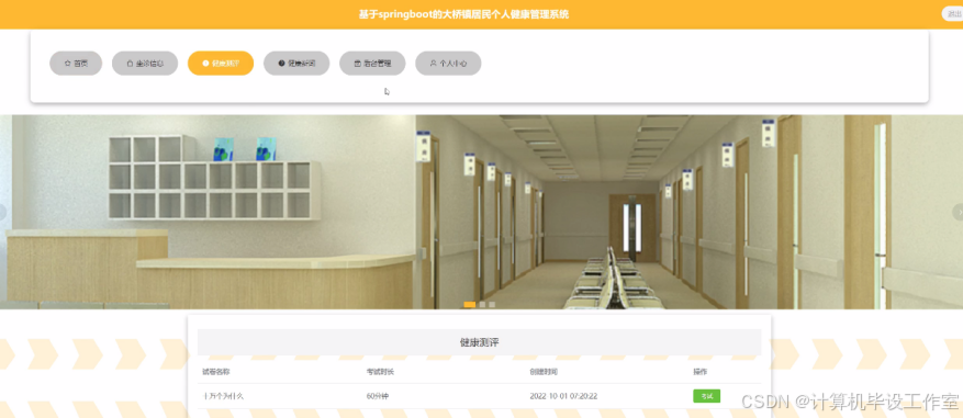 健康测评,在健康测评页面查看试卷名称、考试时长、创建时间等内容,可以点击考试,如图5-6所示: