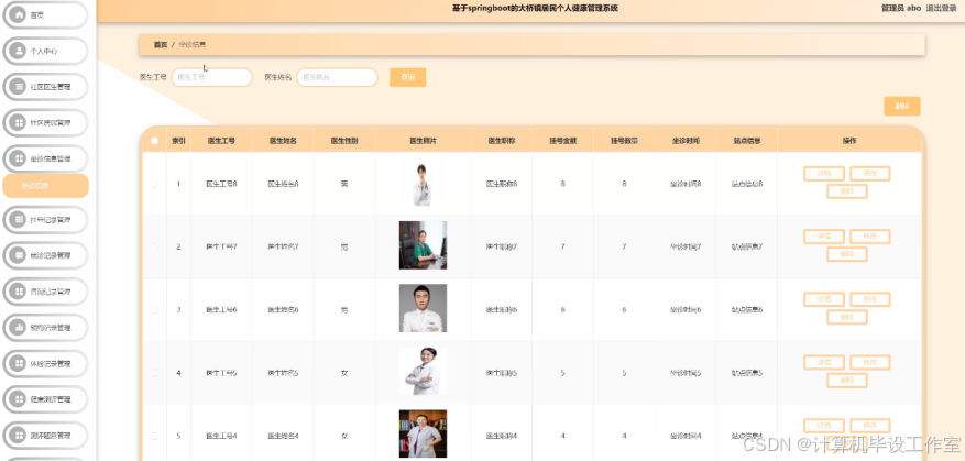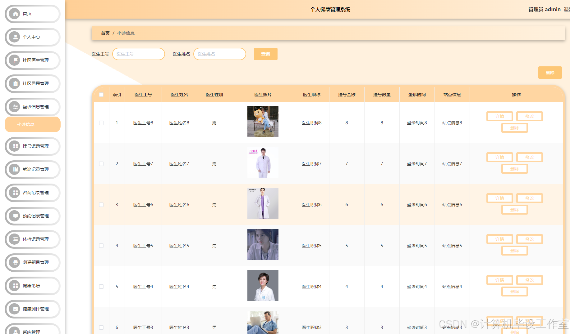 坐诊信息管理:在坐诊信息管理页面,可以对医生工号、医生姓名、医生性别、医生照片、医生职称、挂号金额、挂号数量、坐诊时间、站点信息等内容,进行修改、删除等操作,如图5-11所示: