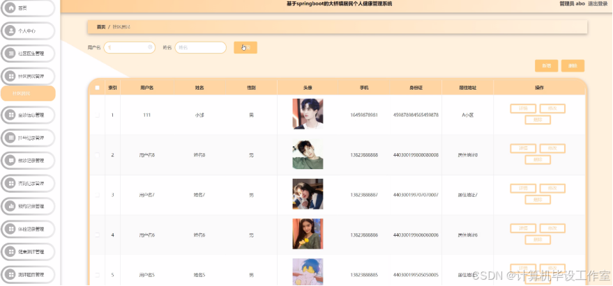 社区居民管理:在社区居民管理页面,可以查看用户名、姓名、性别、头像、手机、身份证、居住地址等内容,进行修改、删除等操作,如图5-10所示: