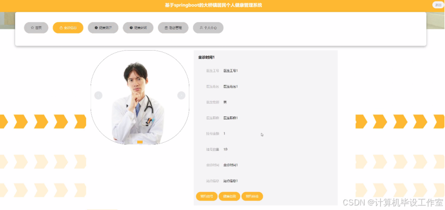 坐诊信息:在坐诊信息页面,可以查看医生工号、医生姓名、医生性别、医生照片、医生职称、挂号金额、挂号数量、坐诊时间、站点信息等信息,如有需要进行预约挂号、健康咨询、预约体检等操作,如图5-5所示: