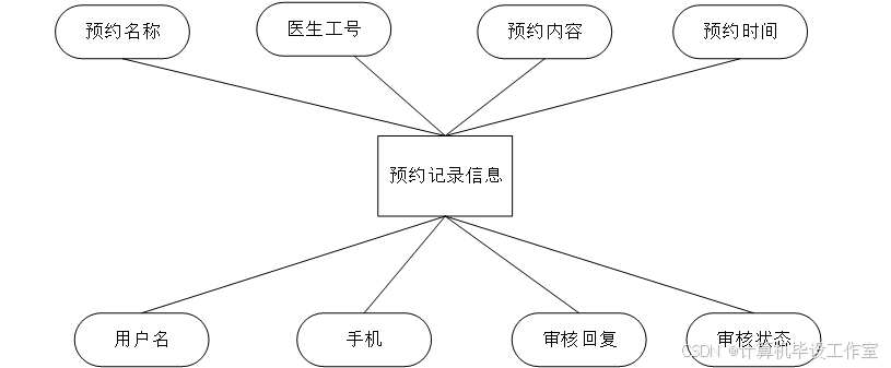 预约记录信息包括;预约名称、医生工号、预约内容、预约时间、用户名、手机、审核回复、审核状态等属性,实体图如图4-3所示。