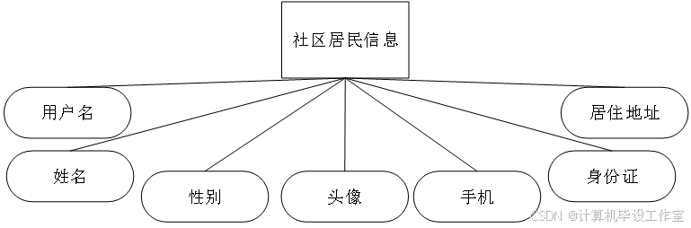 社区居民信息包括;用户名、姓名、性别、头像、手机、身份证、居住地址等信息,实体图如图4-2所示。