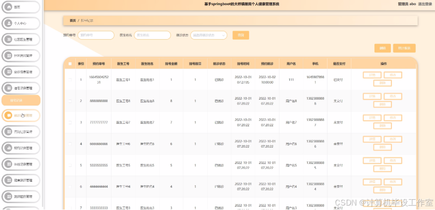 挂号记录管理:在挂号记录管理页面,对预约单号、医生工号、医生姓名、挂号金额、挂号数量、就诊状态、挂号时间、预约就诊、用户名、手机、是否支付等内容,进行修改,删除等操作,如图5-12所示: