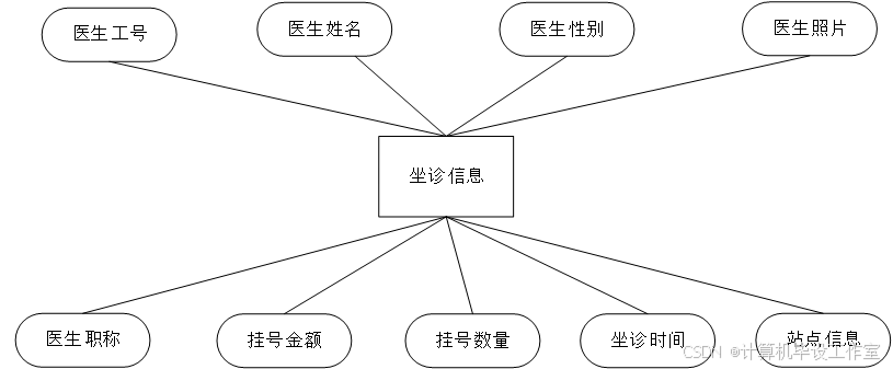 坐诊信息包括;医生工号、医生姓名、医生性别、医生照片、医生职称、挂号金额、挂号数量、坐诊时间、站点信息等属性,如图4-4所示。