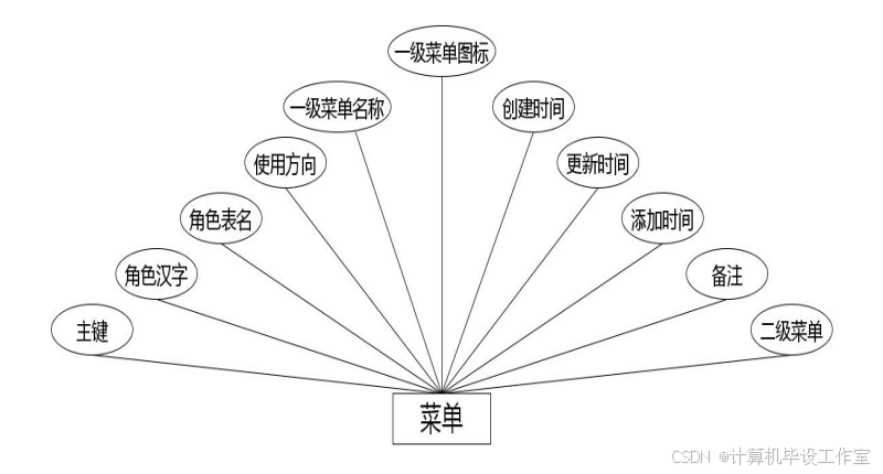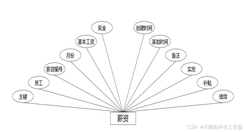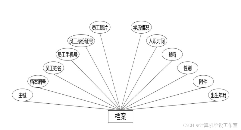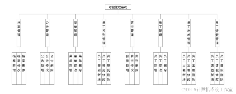 在分析并得出使用者对程序的功能要求时,就可以进行程序设计了。如图4.3展示的就是管理员功能结构图,管理员在后台主要管理档案管理、字典管理、公告管理、菜单管理、员工签到管理、薪资管理、员工管理、员工出差管理、员工请假管理、管理员管理等。