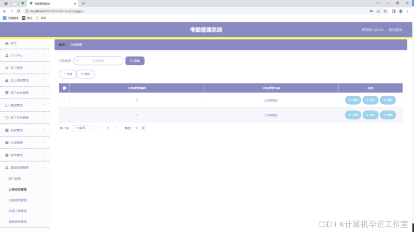 公告类型管理页面显示所有公告类型,在此页面既可以让管理员添加新的公告信息类型,也能对已有的公告类型信息执行编辑更新,失效的公告类型信息也能让管理员快速删除。下图就是公告类型管理页面。