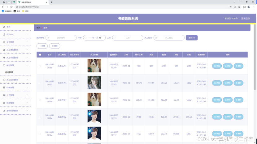 如图5.4显示的就是薪资管理页面,此页面提供给管理员的功能有:新增薪资,修改薪资,删除薪资。