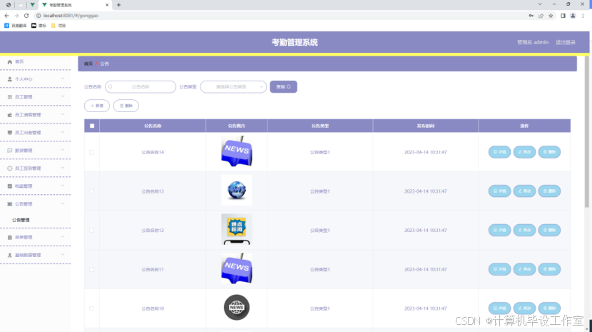 公告信息管理页面提供的功能操作有:新增公告,修改公告,删除公告操作。下图就是公告信息管理页面。