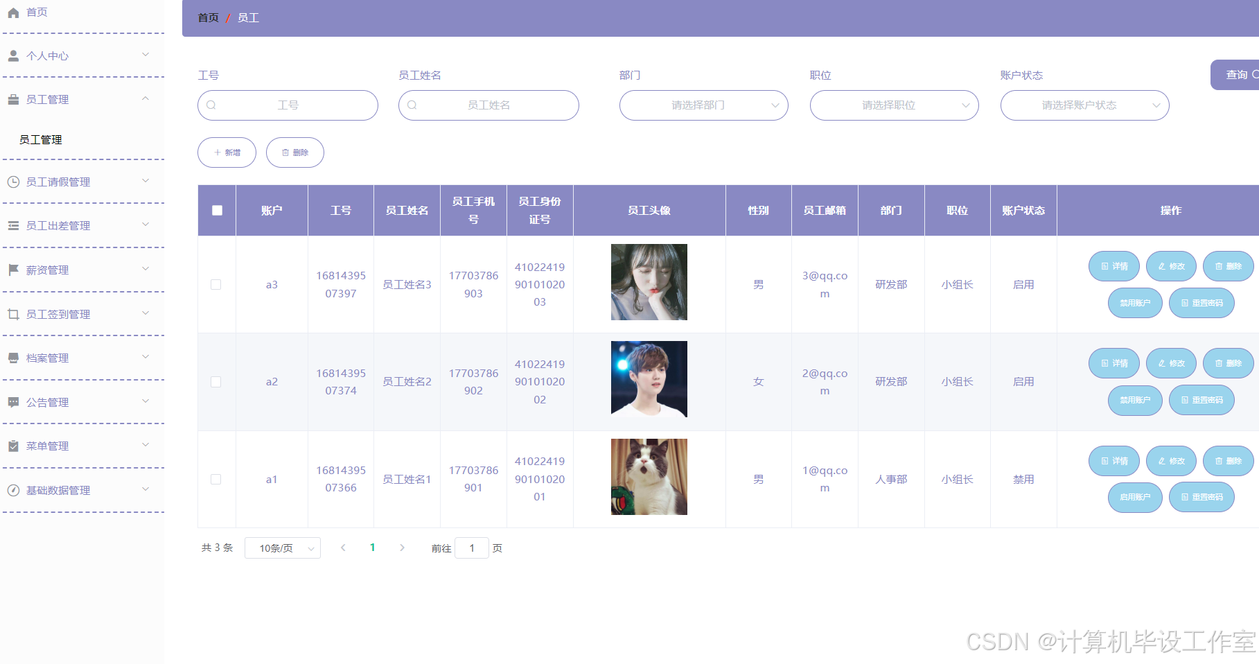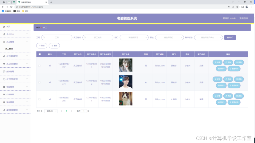 如图5.1显示的就是员工列表页面,此页面提供给管理员的功能有:查看员工、新增员工、修改员工、删除员工等。