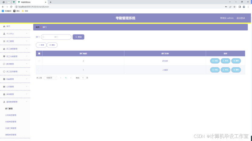 如图5.5显示的就是部门管理页面,此页面提供给管理员的功能有:新增部门,修改部门,删除部门。