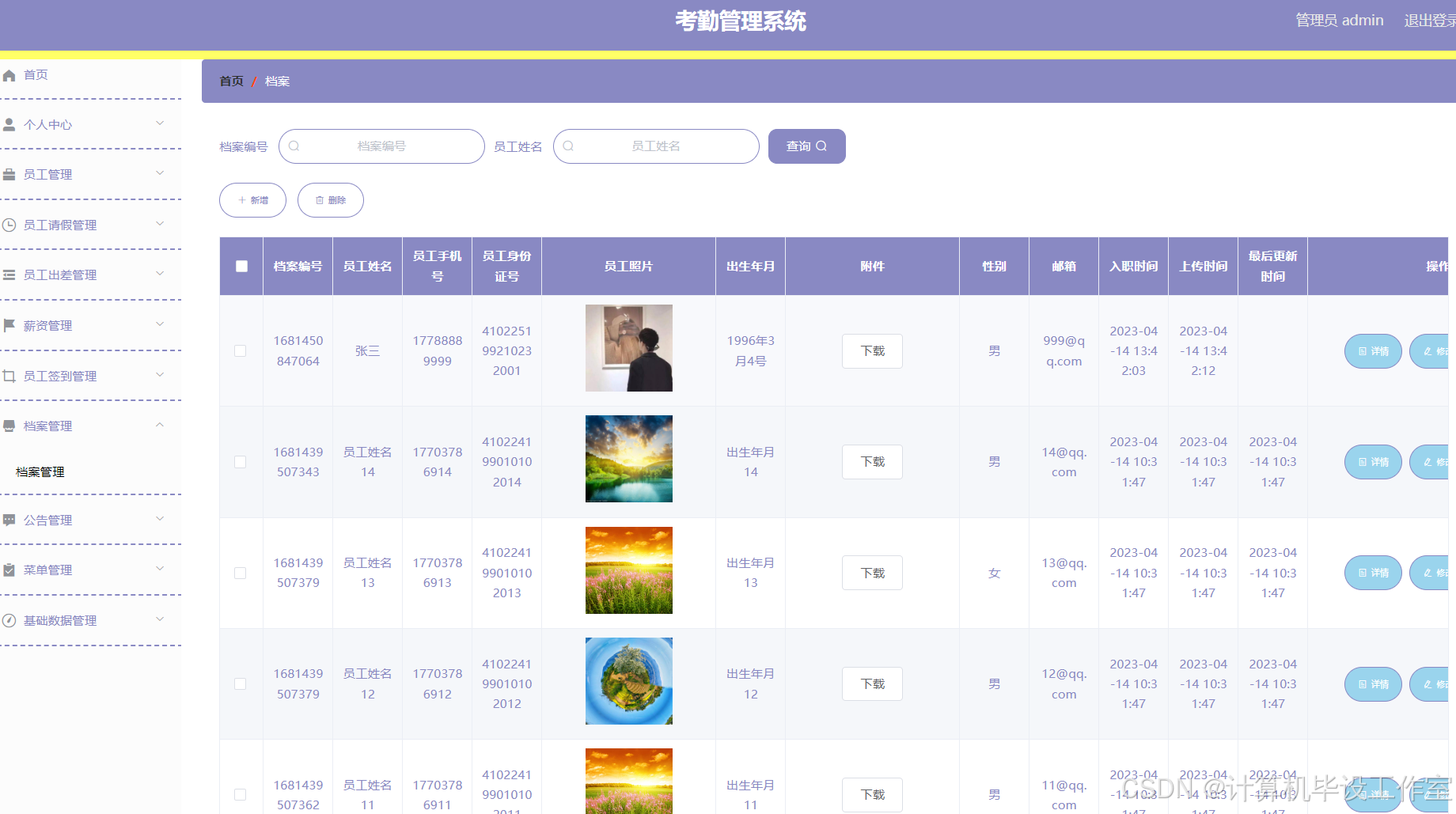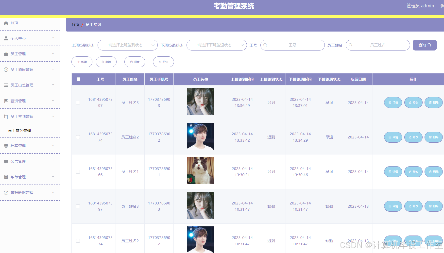管理员可以进行管理档案管理、字典管理、公告管理、菜单管理、员工签到管理、薪资管理、员工管理、员工出差管理、员工请假管理、管理员管理等功能。