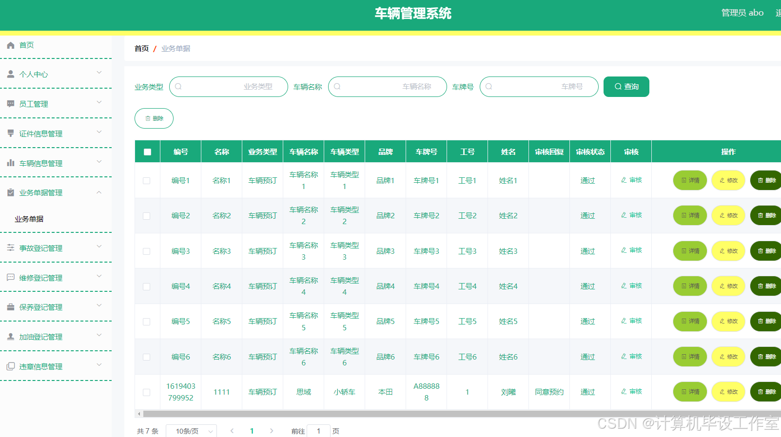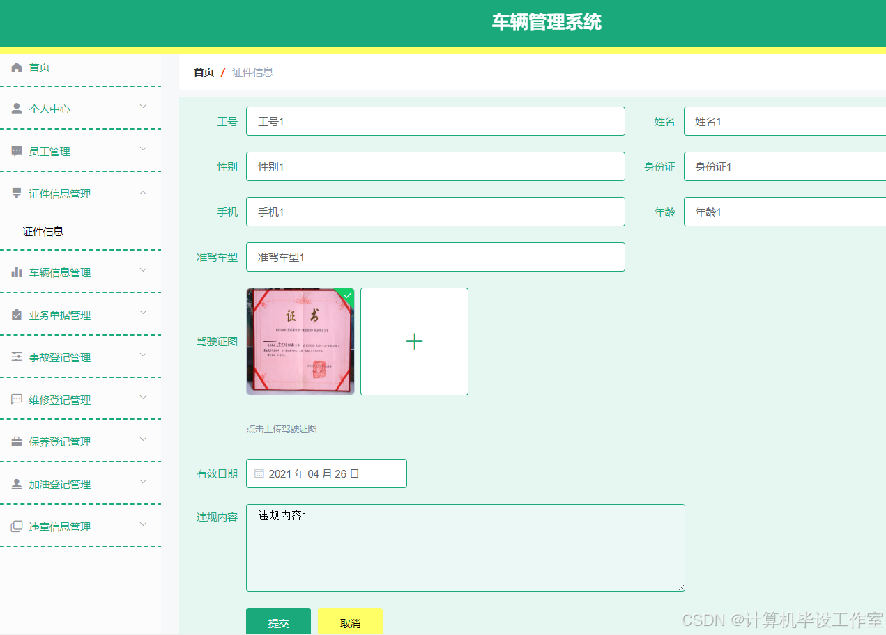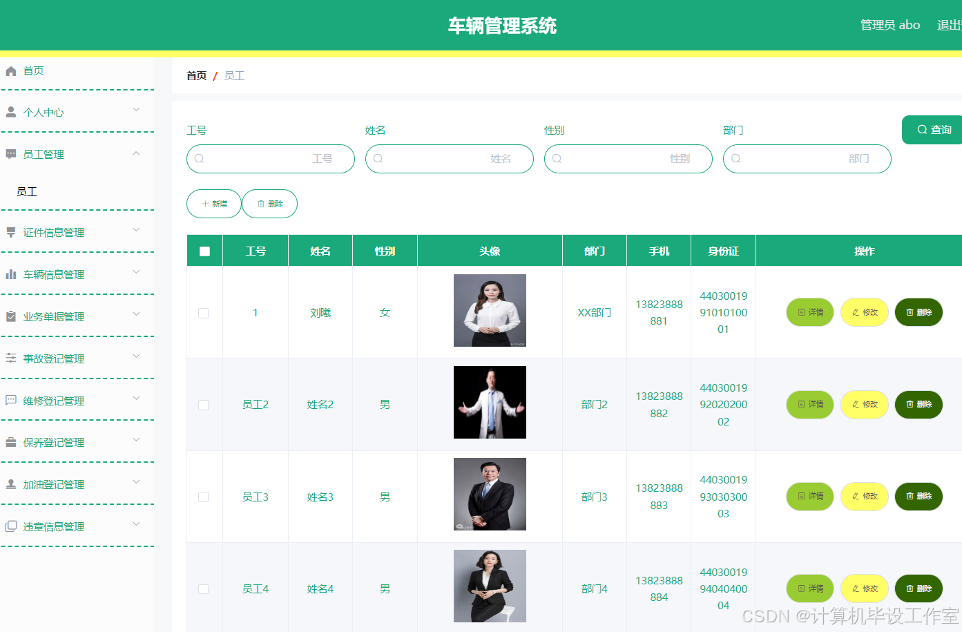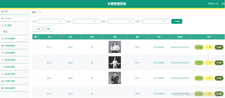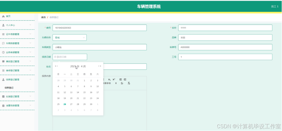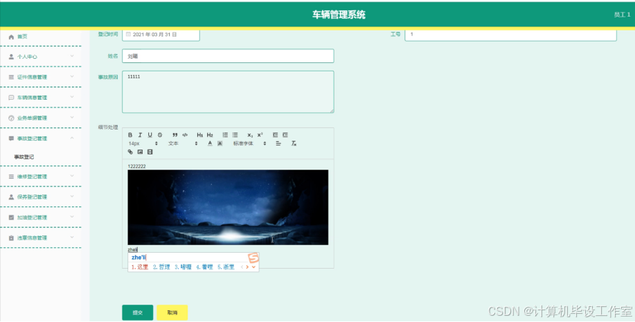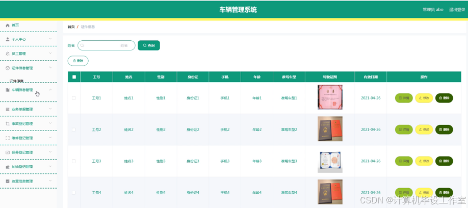 (2)员工功能有个人中心,证件信息管理,车辆信息管理,业务单据管理,事故登记管理,维修登记管理,保养登记管理,加油登记管理,违章信息管理。因而具有一定的实用性。