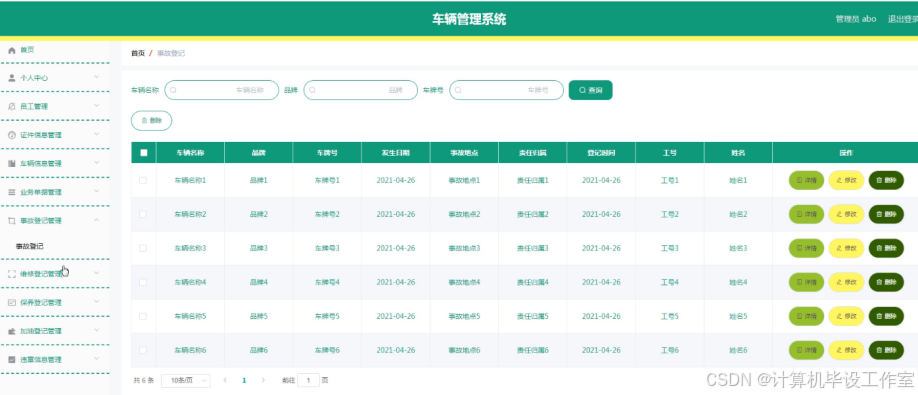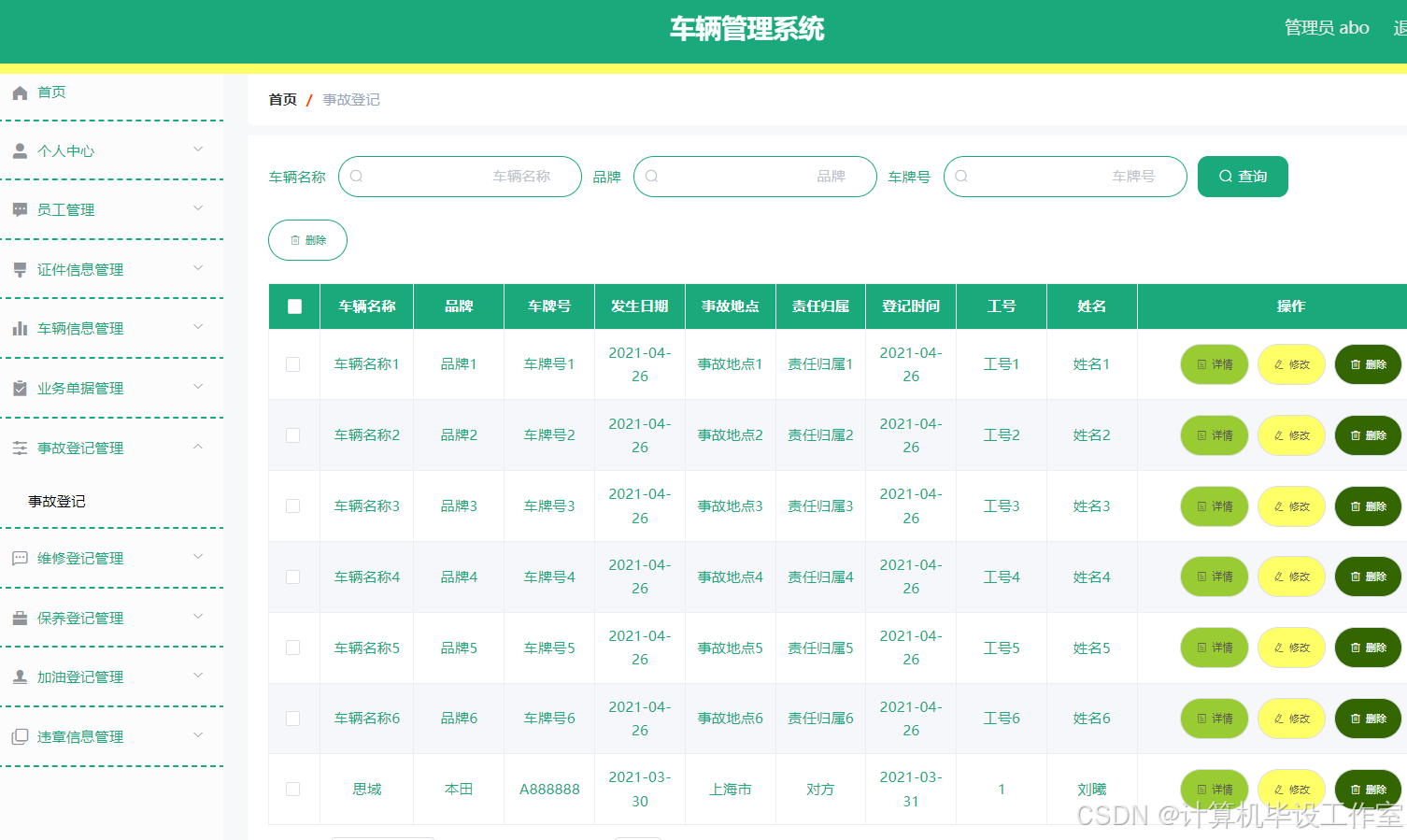 管理员可以对事故登记信息进行修改删除操作。界面如下图所示: