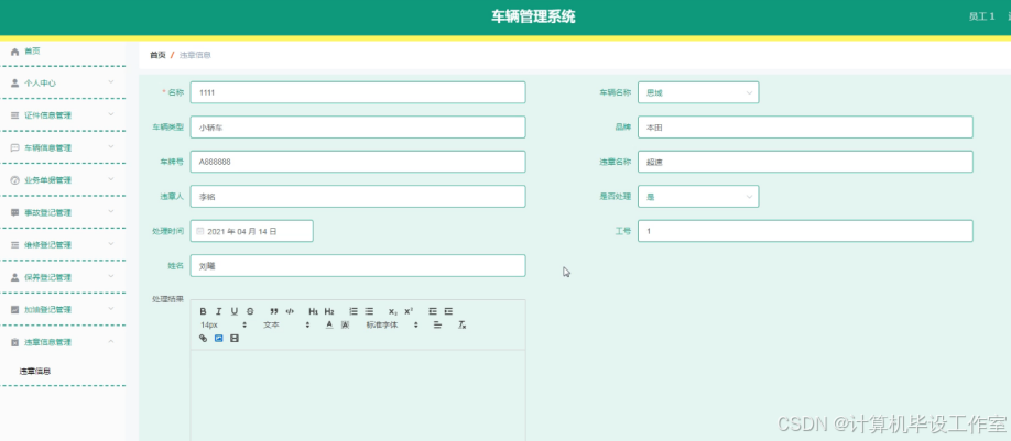 员工可以对违章进行添加修改删除操作。界面如下图所示: