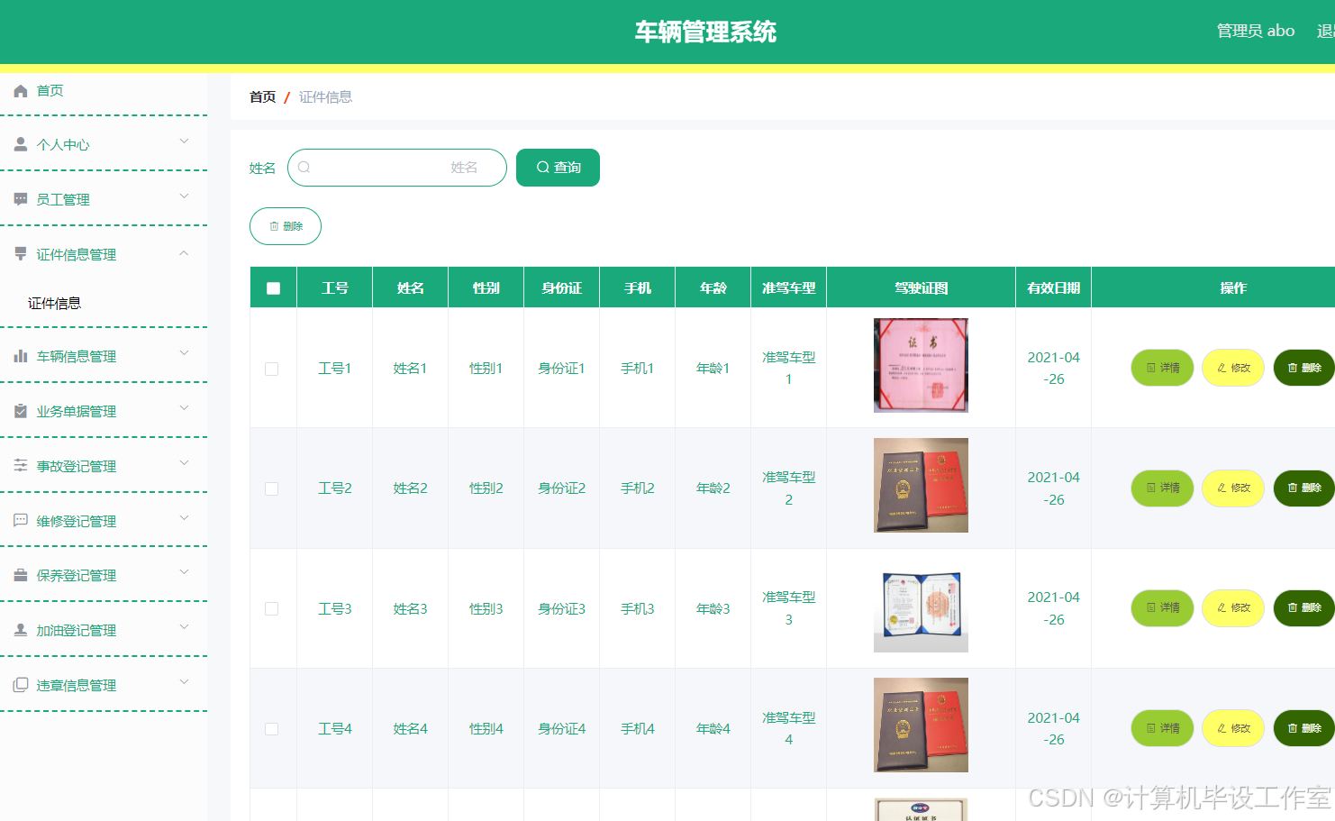 员工功能有个人中心,证件信息管理,车辆信息管理,业务单据管理,事故登记管理,维修登记管理,保养登记管理,加油登记管理,违章信息管理。因而具有一定的实用性。