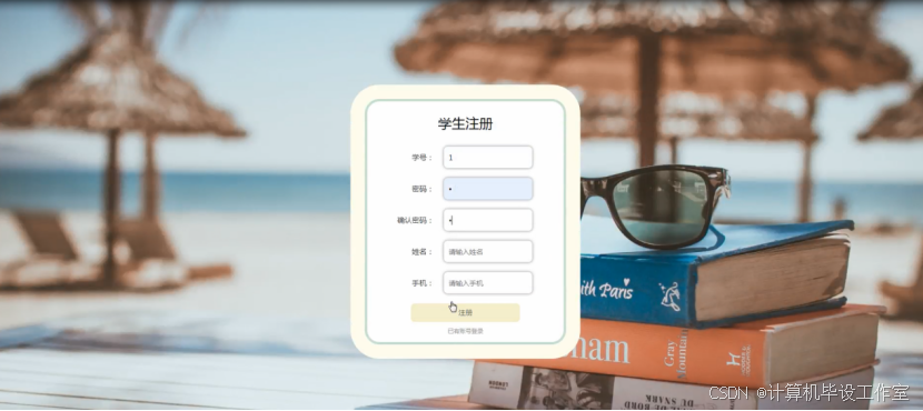 学生注册,在学生注册页面通过填写学号、密码、确认密码、姓名、手机等内容进行注册等操作,如图5-2所示。