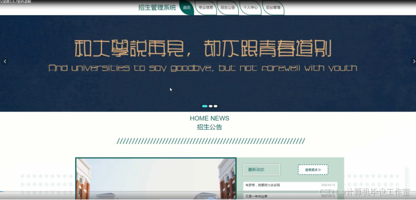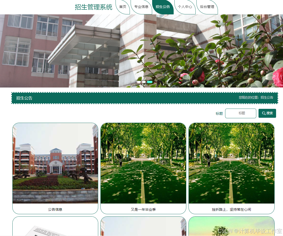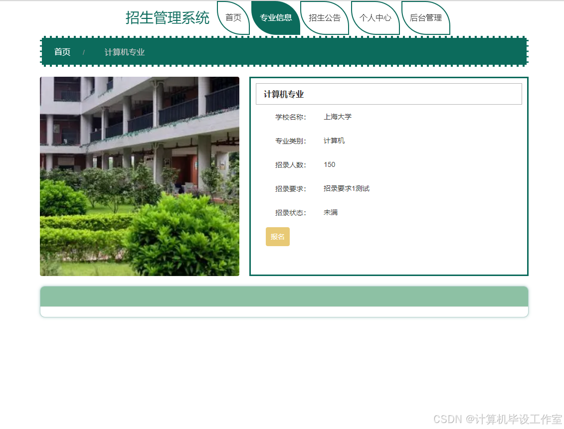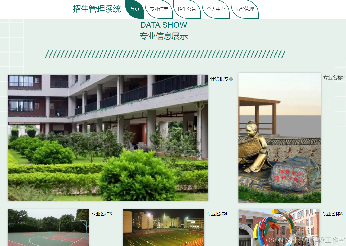 招生管理系统,在系统首页可以查看首页、专业信息、招生公告、个人中心、后台管理等内容进行详细操作,如图5-1所示。