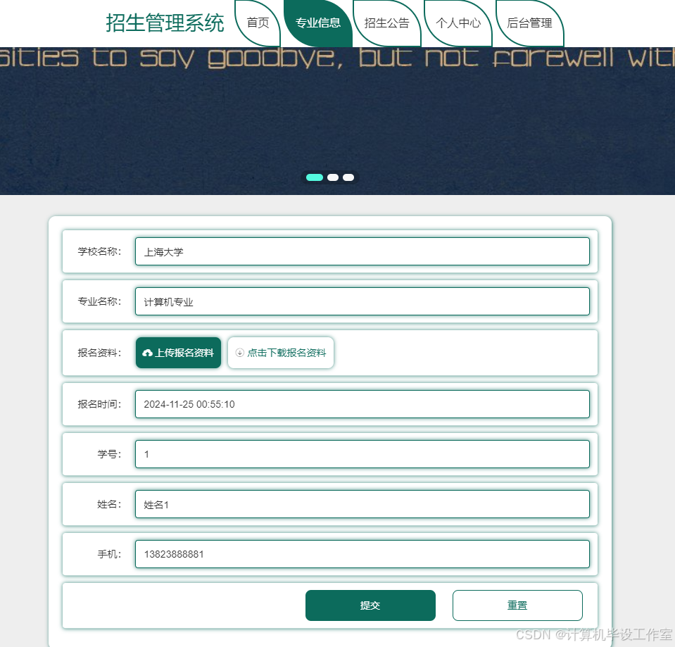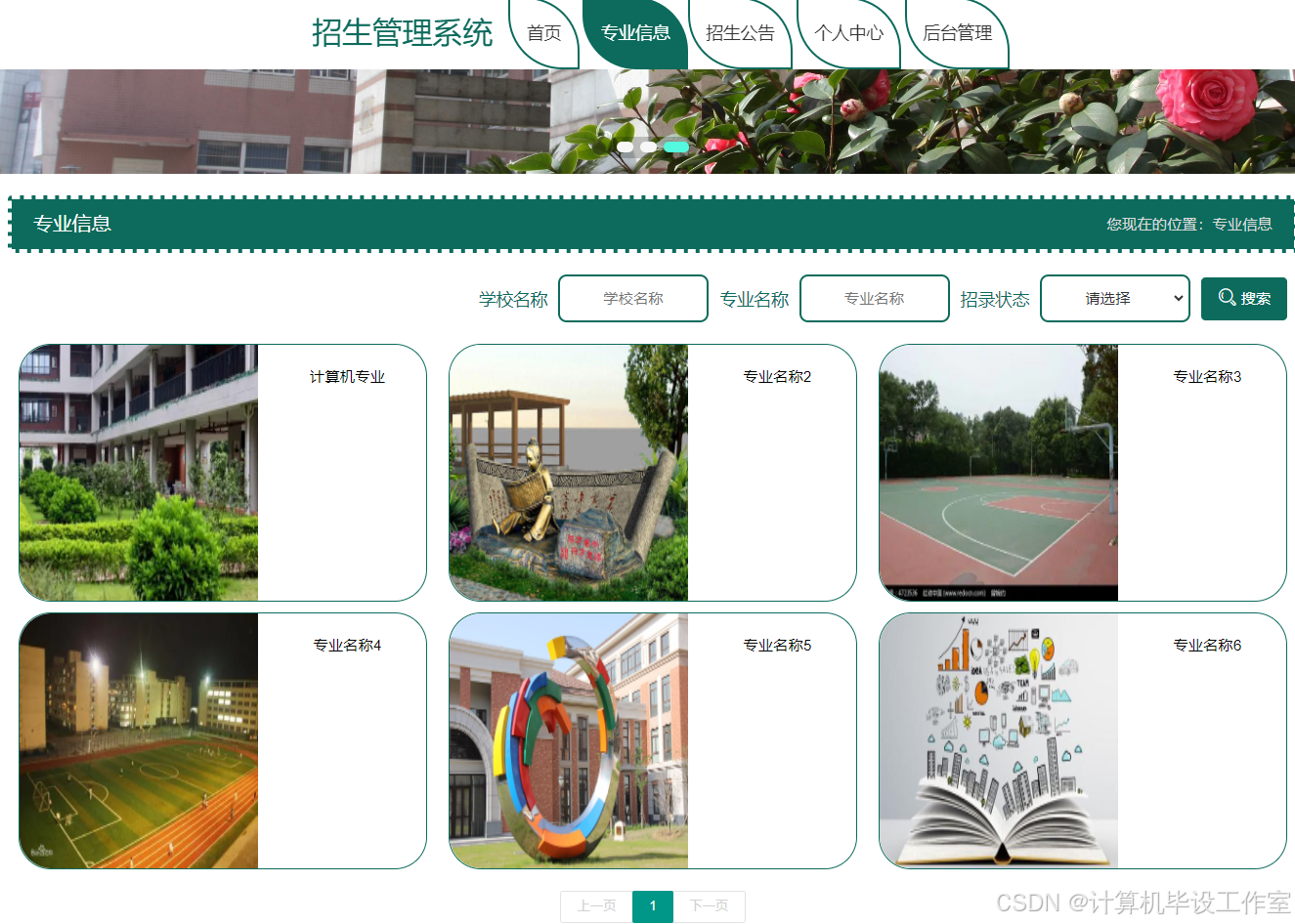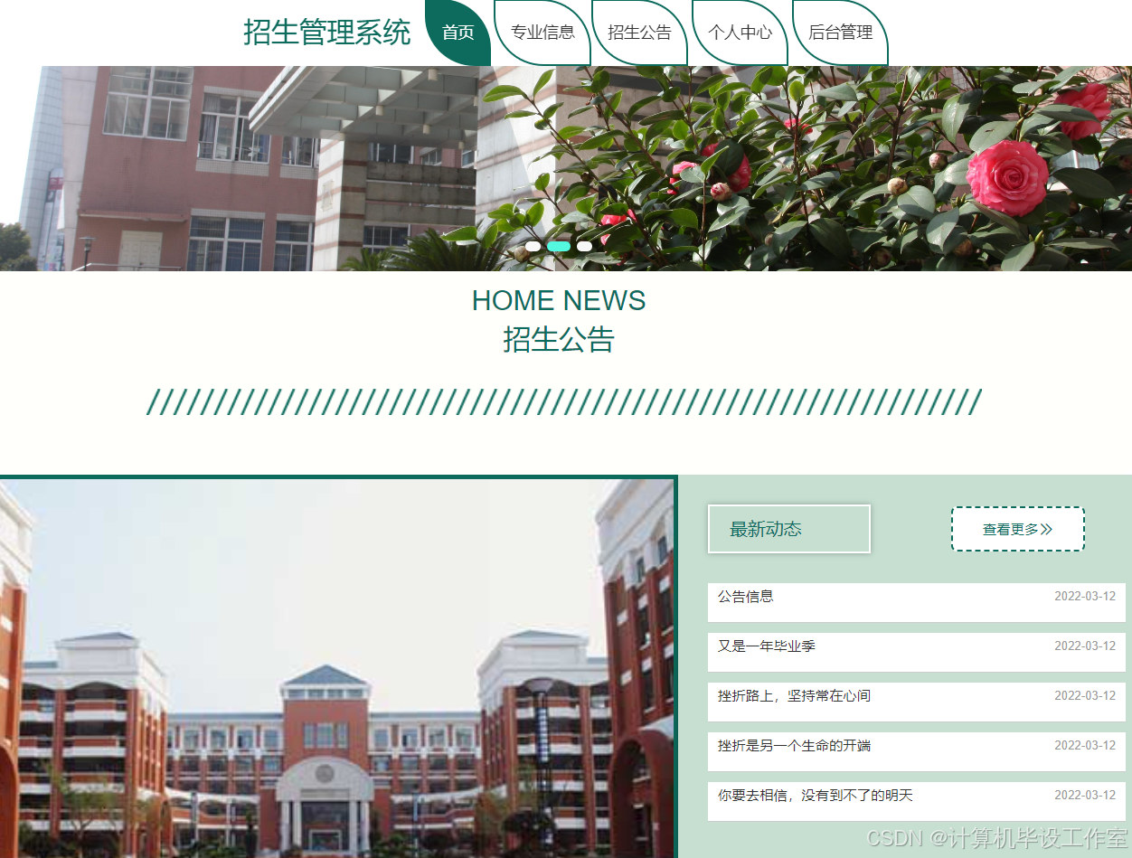 招生管理系统,在系统首页可以查看首页、专业信息、招生公告、个人中心、后台管理等内容进行详细操作,如图5-1所示。