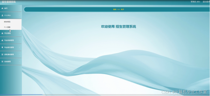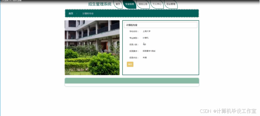 本次设计任务是要设计一个招生管理系统,通过这个系统能够满足管理员和学生的招生公告管理功能。系统的主要功能包括首页、个人中心、学生管理、专业信息管理、专业报名管理、录取通知管理、系统管理等功能。