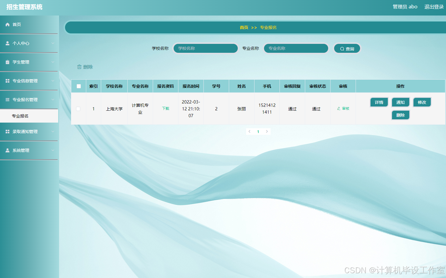 管理员可以实现个人中心、学生管理、专业信息管理、专业报名管理、录取通知管理、招生公告管理、系统管理等内容进行管理