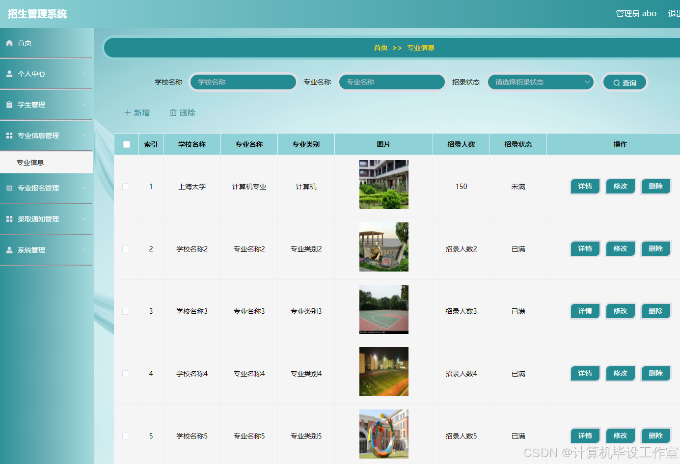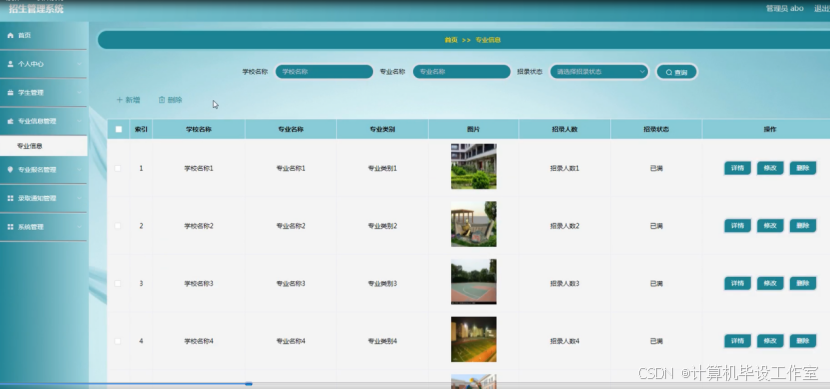 专业信息管理,在专业信息管理页面可以对索引、学校名称、专业名称、专业类别、图片、招录人数、招录状态等内容进行详情、修改或删除等操作,,如图5-8所示。