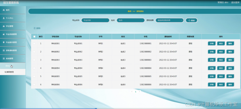 录取通知管理,在录取通知管理页面可以对索引、学校名称、专业名称、学号、姓名、手机、通知时间、录取结果等内容进行详情、修改或删除等操作,如图5-10所示。