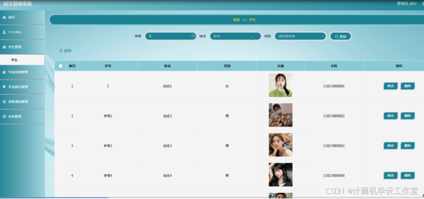 学生管理,在学生管理页面可以对索引、学号、姓名、性别、头像、手机等内容进行修改或删除等操作,如图5-7所示。