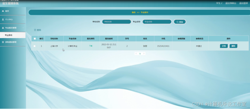专业报名管理,在专业报名管理页面可以对索引、学校名称、专业名称、报名资料、报名时间、学号、姓名、手机、审核回复、审核状态等内容进行详情或删除等操作,如图5-13所示。