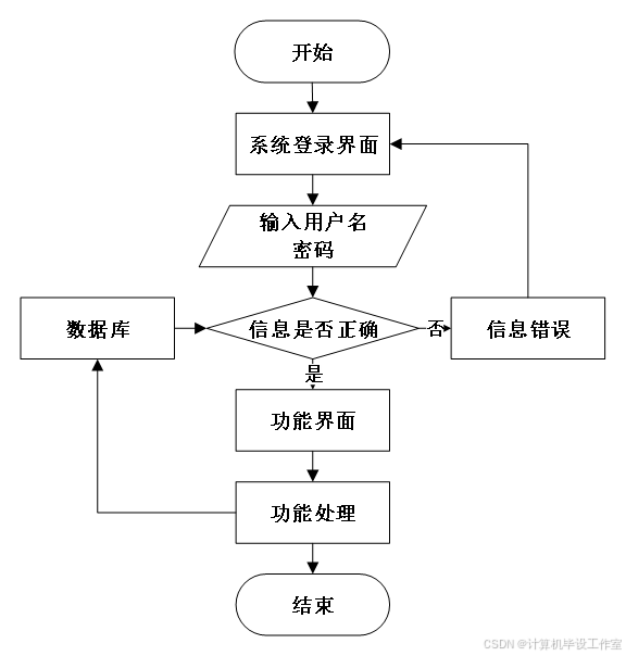 登录:录入登录信息,账号,密码,权限,点击登录按钮,会出现两种情况:登录成功进入用户具有权限的功能界面和提示登录失败。