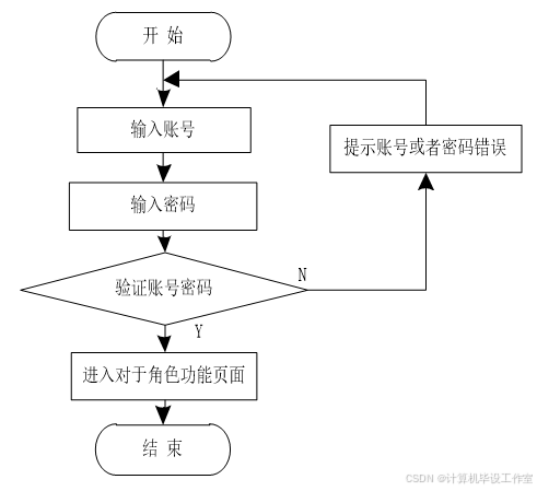 不论用户、管理员均有登陆功能,两类用户登陆时步骤相同,均需首先访问其相应人物登陆网页,再开始录入账号、录入密码,当系统收到用户录入的登录信息后,会响应判断是否正确并与人物相对应,则自动跳过人物功能页面,登录这一步骤可以用流程图来展现,如下: