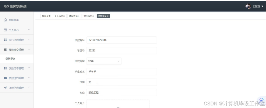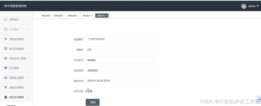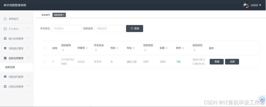 高等教育的普及化是社会发展的重要目标,国家以及各大高效纷纷制定了助学贷款政策,用于支持山区或者有经济困难的学生顺利完成学业,以往传统的助学贷款需要学生在学校开具相关证明后跑银行柜台进行办理,耗费时间之余流程繁琐,同时存在信息不对称的问题。现今随着信息技术的发展,开发助学贷款管理系统有助于提高贷款效率以及透明度,通过助学贷款管理系统,可以实现在线提交贷款申请、发放、还款操作,促进助学贷款工作的规范化和智能化。