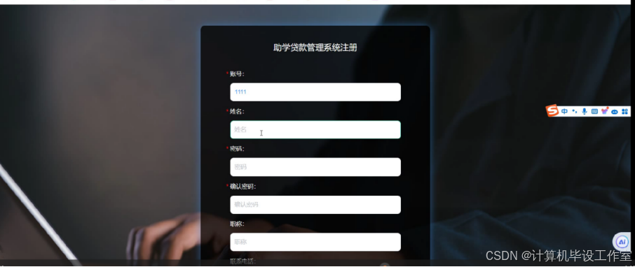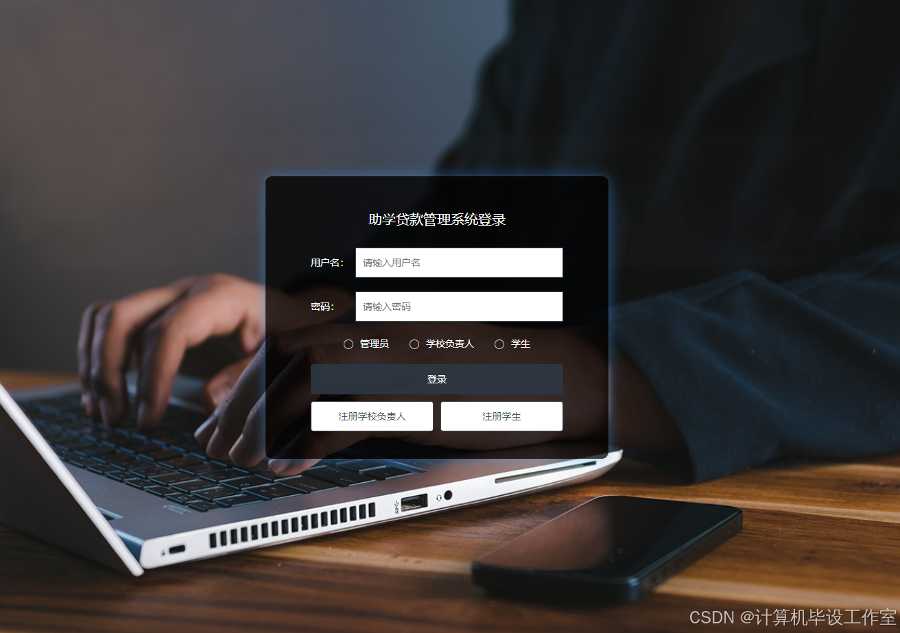学生用户的账号由自己注册的,如果一开始没有账号,可以在登录界面,点击“注册”按钮,然后输入学生用户的具体信息,点击注册按钮进行注册,只有注册成功以后,才可以通过账号密码可以登录到系统中,进行相关操作,包括个人中心、银行信息管理、贷款提交管理、放款信息管理、贷款违约管理、还款信息管理。