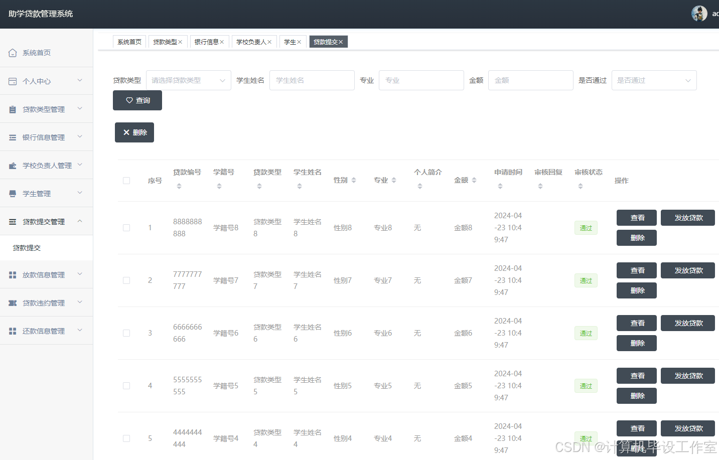 学校负责人点击“贷款提交”按钮可以对学生用户提交的助学贷款申请进行审核。界面如下图4.8所示。